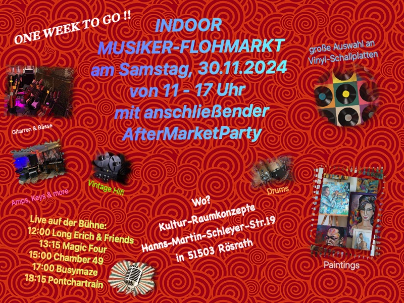 Der Besitzer unseres Proberaumes veranstaltete einen Indoor Musiker-Flohmarkt in den Räumen in Rösrath und wir durften das Live-Programm als Schlussact beenden. Die Organisation war hervorragend und wir hatten einen schönen Konzertabend, wenn das Publikum aufgrund der vortgeschritten Zeit schon ein wenig dezimiert war.